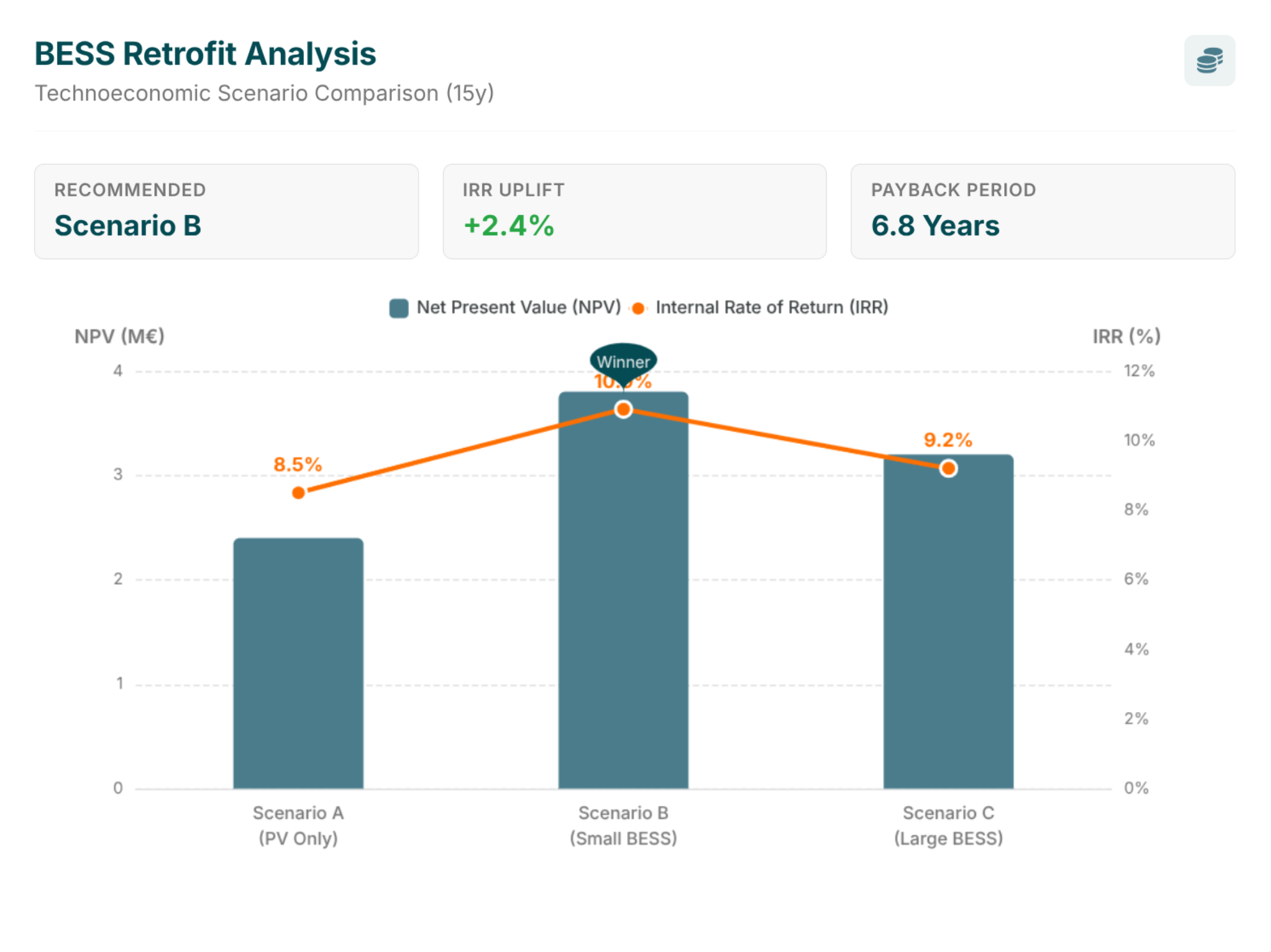 We performed a high-fidelity investment evaluation for a Swiss manufacturer with on-site PV and continuous industrial load to find the optimal behind-the-meter BESS configuration and operating strategy before capital commitment.