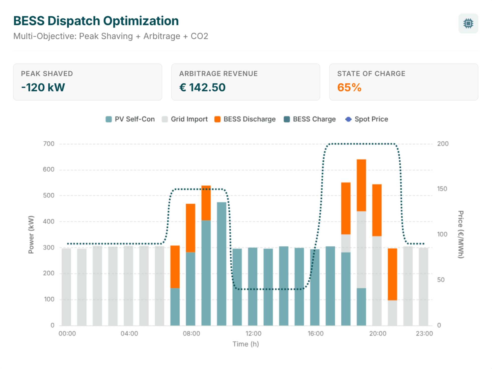 BESS and other flexible assets are dispatched via static rules or isolated optimizers, preventing co-optimization across peak shaving, market participation, and revenue stacking.